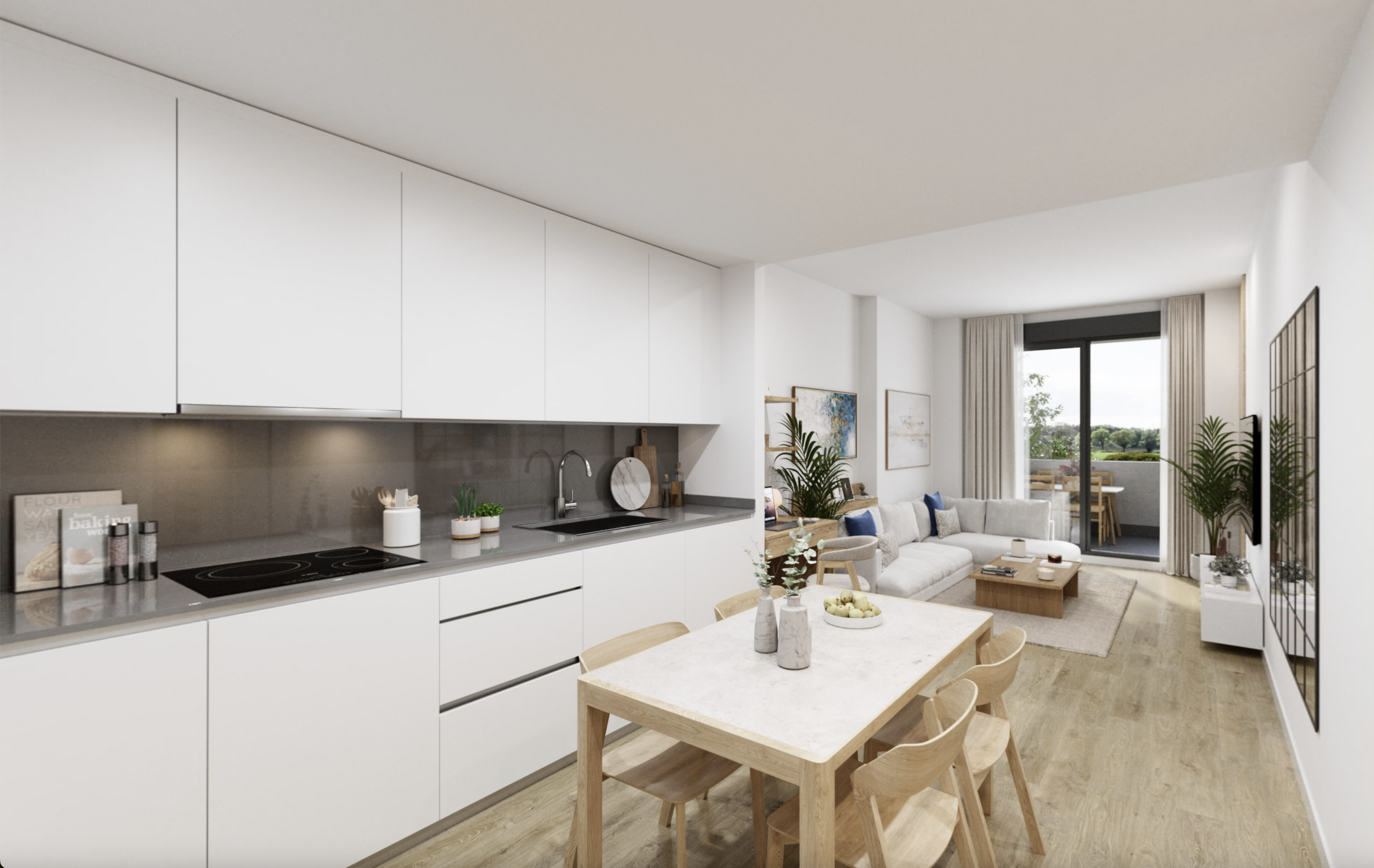 Las terrazas, abiertas y bien orientadas, amplían la vivienda hacia el exterior y se integran en la rutina diaria: empezar el día al aire libre, alargar la tarde sin prisas, vivir el espacio sin artificios.