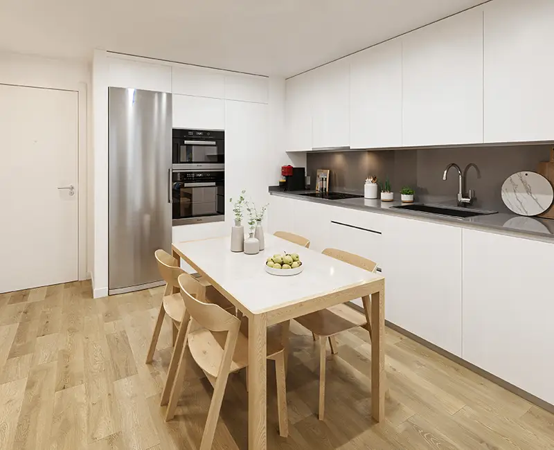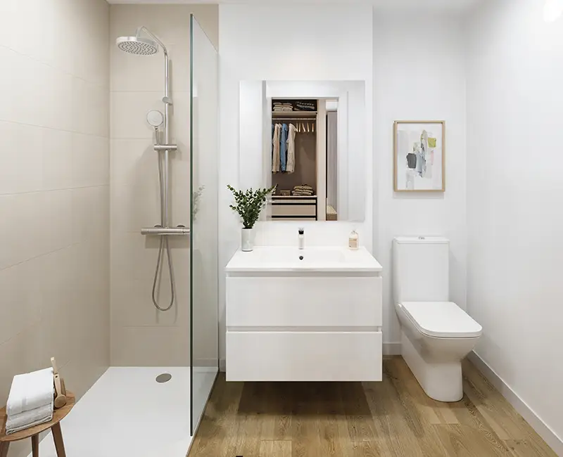 Habitar el silencio, paso a paso. En Yarae Silven, cada superficie construye la atmósfera del hogar y define cómo se vive el espacio desde el primer paso. El pavimento de gres cerámico efecto madera, continuo en toda la vivienda, aporta unidad, calidez y fluidez visual, con distintas tonalidades disponibles. En baños, el revestimiento cerámico se concentra en zonas húmedas y se combina con pintura lisa en el resto de los paramentos, creando espacios luminosos y confortables. Paredes y techos en pintura lisa blanca refuerzan la luz natural y la sensación de orden y calma.
