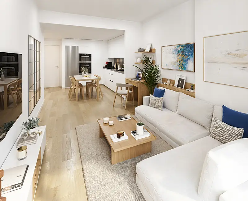 El proyecto está formado por 88 viviendas de dos dormitorios, desarrolladas en régimen de cooperativa, concebidas desde una idea sencilla y exigente a la vez: que cada hogar funcione con naturalidad. Estancias que respiran, recorridos claros, silencio bien resuelto y decisiones constructivas que aportan orden y calma.